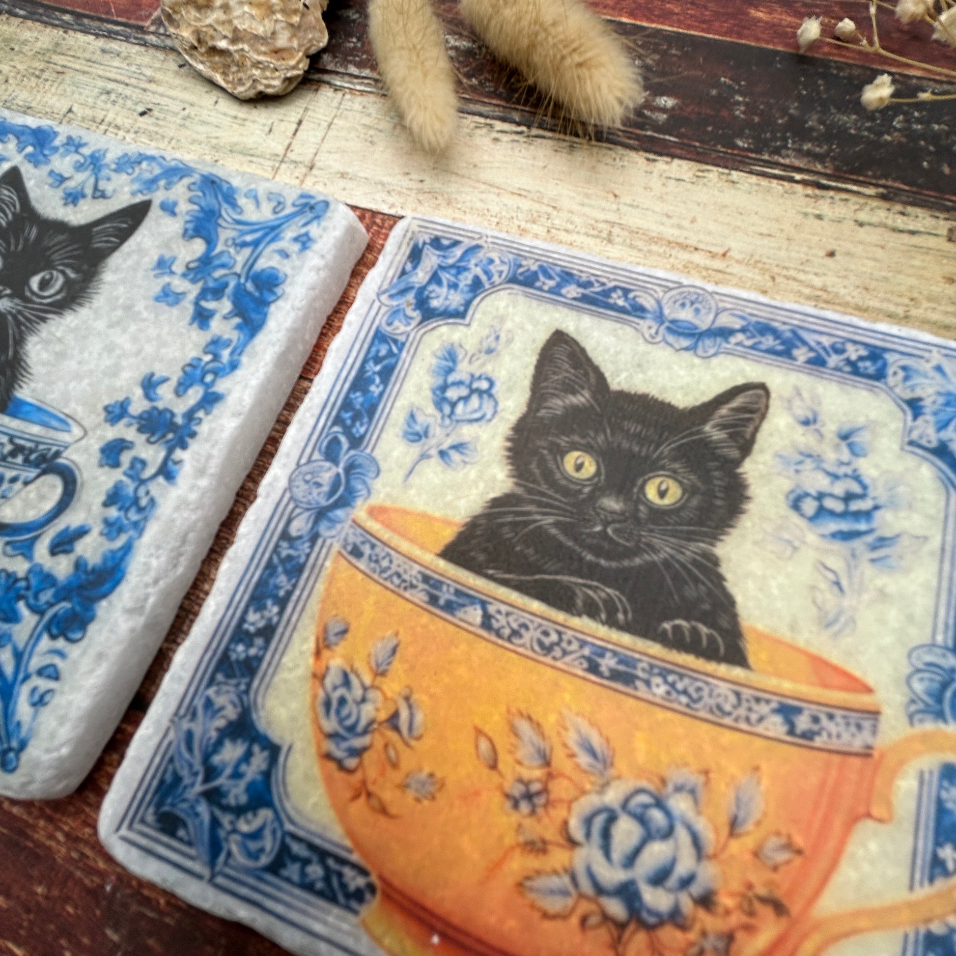 This charming set of two natural stone coasters showcases adorable illustrations of cats in Cups, in a vintage, antique tile style. Each 10 x 10 cm coaster has a tumbled stone finish for a classic look, with cork backing to protect your surfaces. Perfect for cat lovers and a lovely touch for any decor!