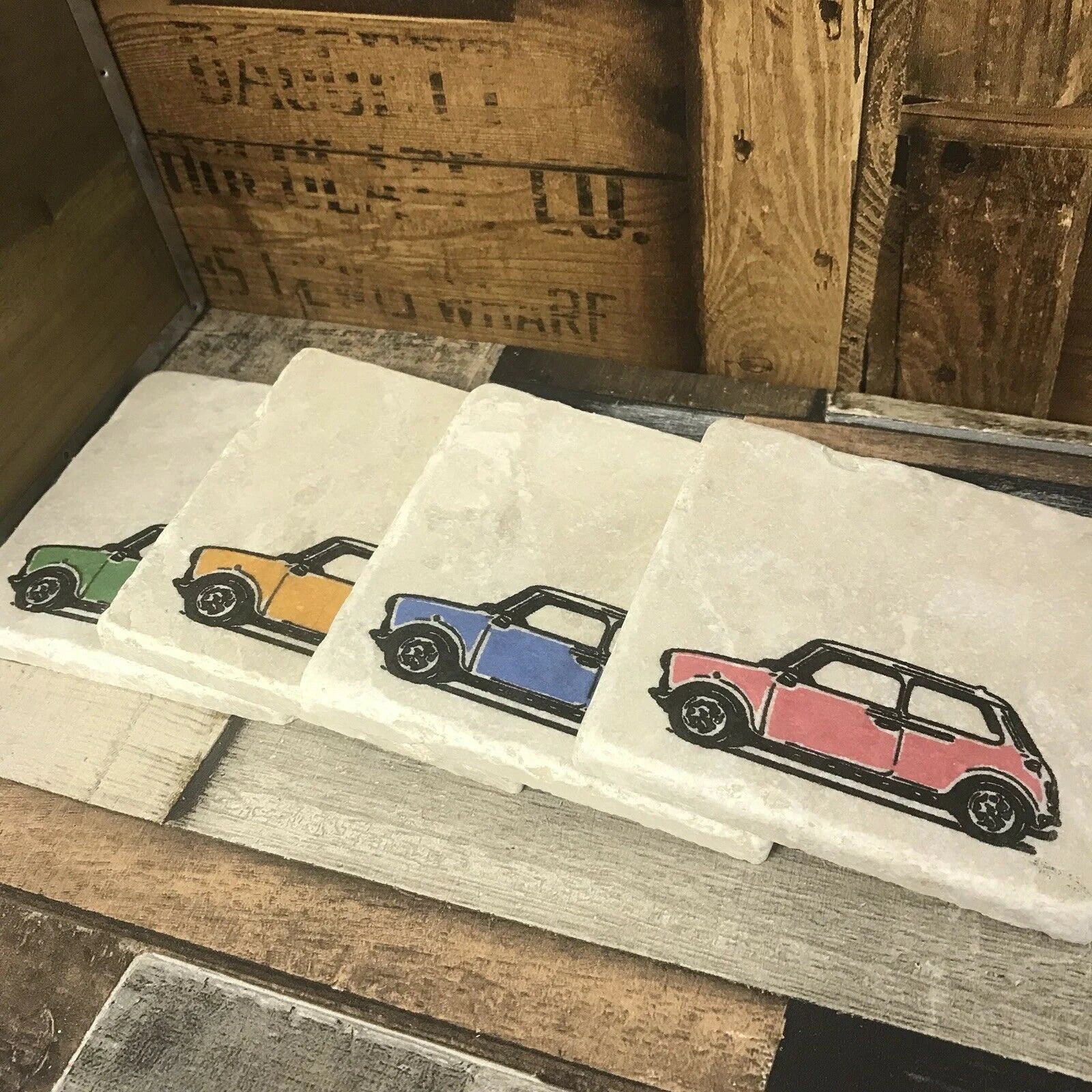 This vibrant set of four natural stone coasters features watercolour illustrations of classic Mini cars, each in a different color: pink, blue, yellow, and green. Measuring 10 x 10 cm, these coasters have a tumbled stone finish and cork backing to protect surfaces. A must-have for car enthusiasts and lovers of colorful design!