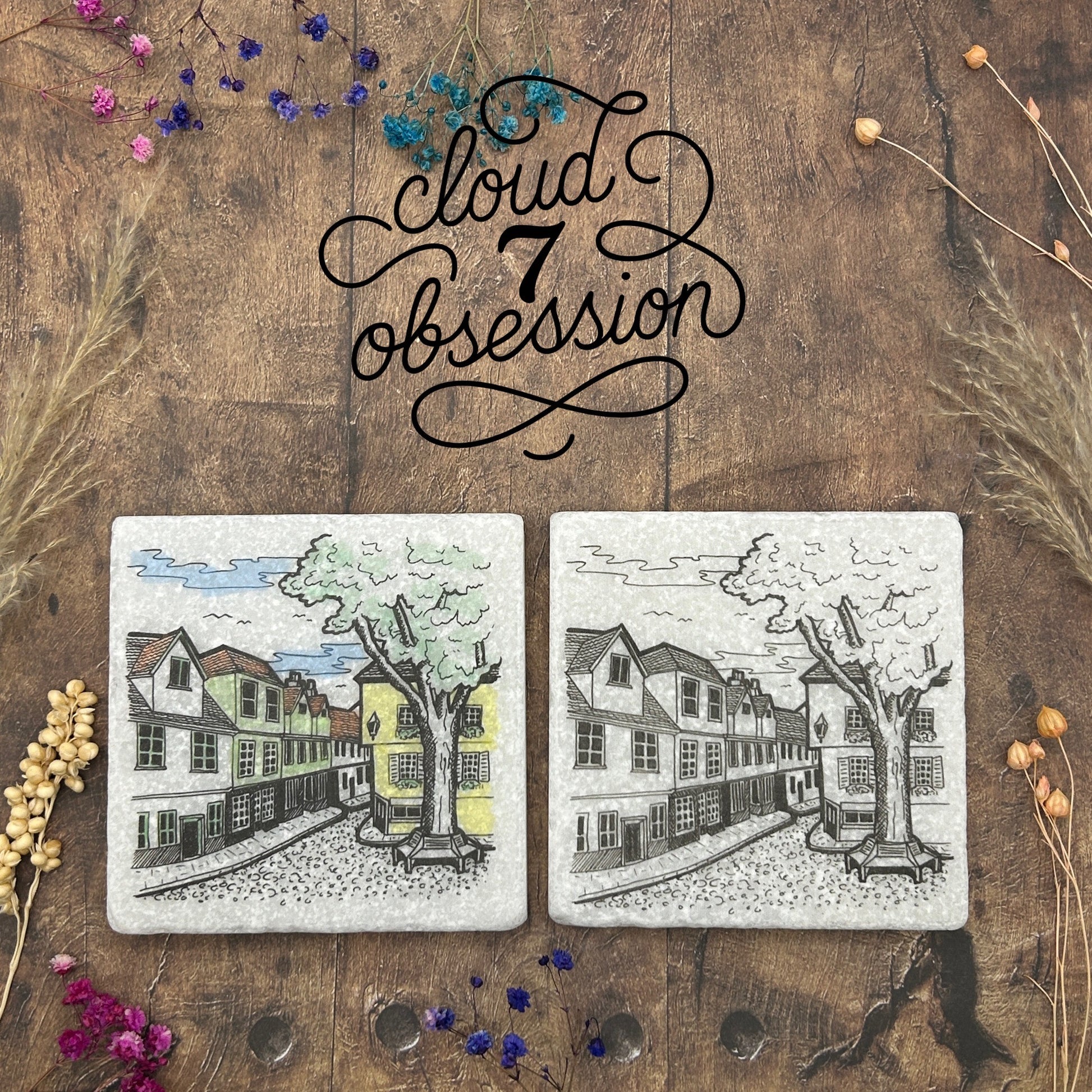 Set of 2 Elm Hill Coasters – Watercolour or Urban Ink Sketch