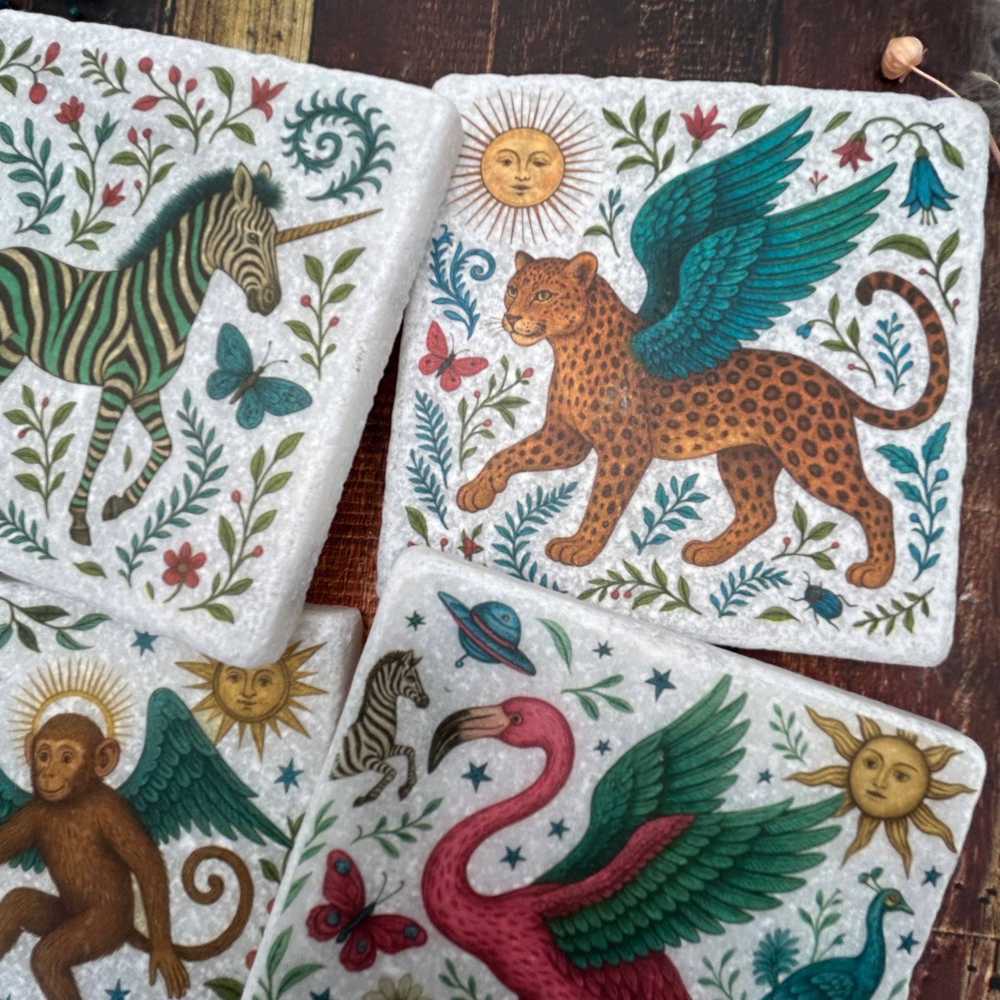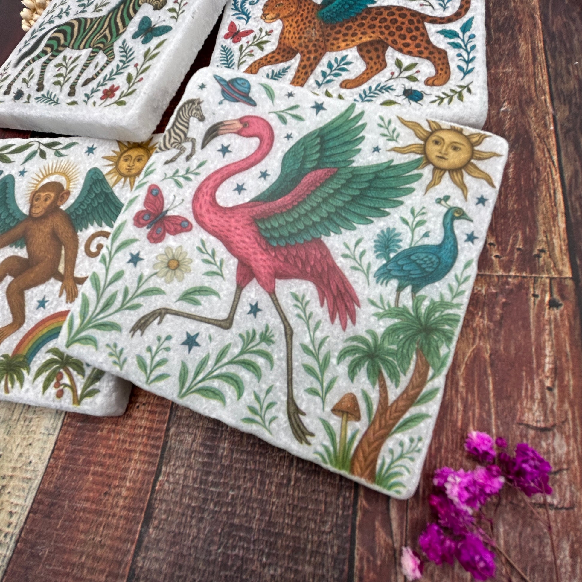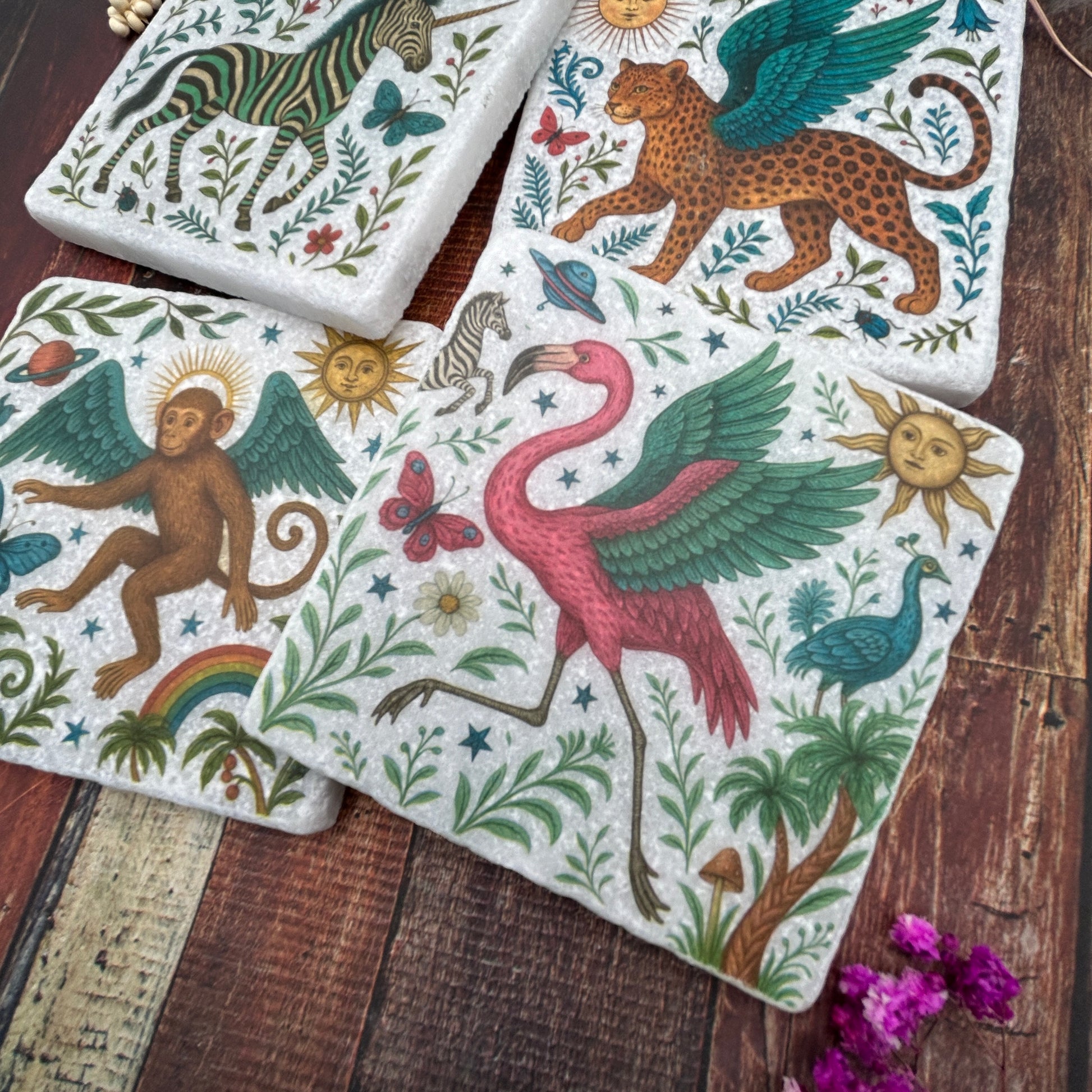 Add a splash of colour and wild imagination to your home with the Flight of the Wild coaster set. This vibrant collection features four striking animal designs: a flamboyant flamingo, a mischievous winged monkey, a majestic zebra, and a fierce winged leopard – each brought to life in bright, bold colours.