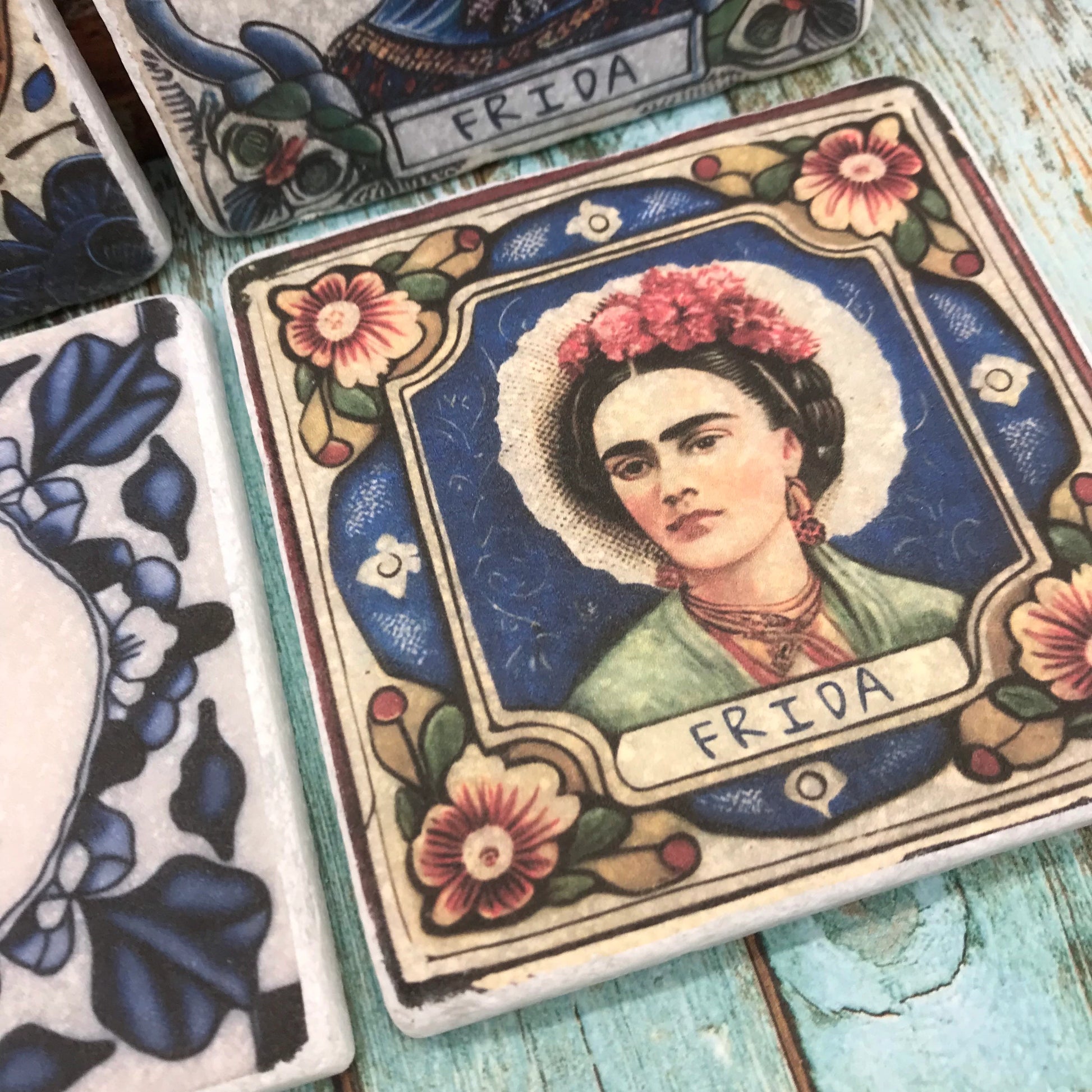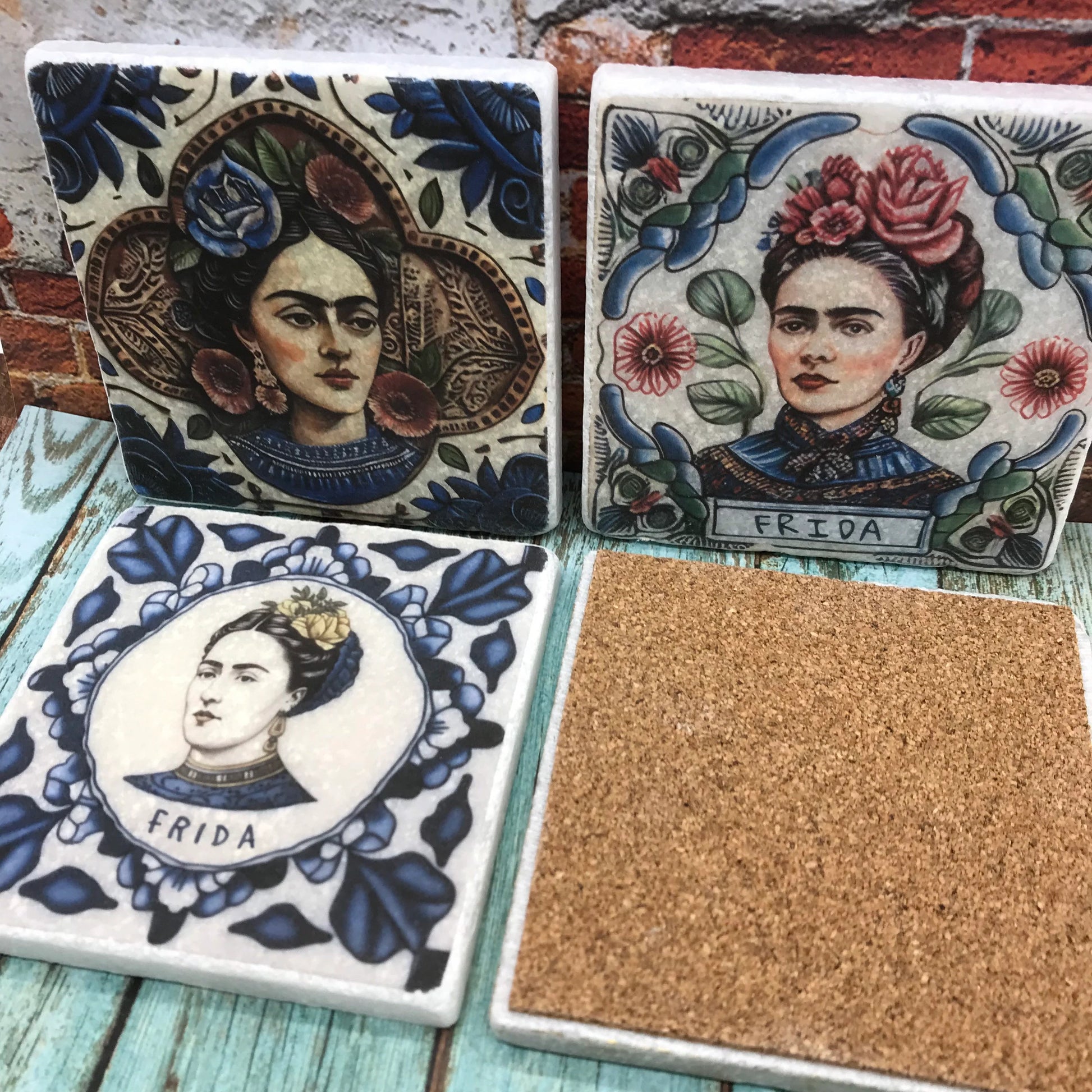 Introducing our stunning natural stone coasters, featuring four unique illustrations of Frida Kahlo in an antique Mexican tile style. Each coaster is carefully crafted by hand, ensuring that no two are exactly alike.