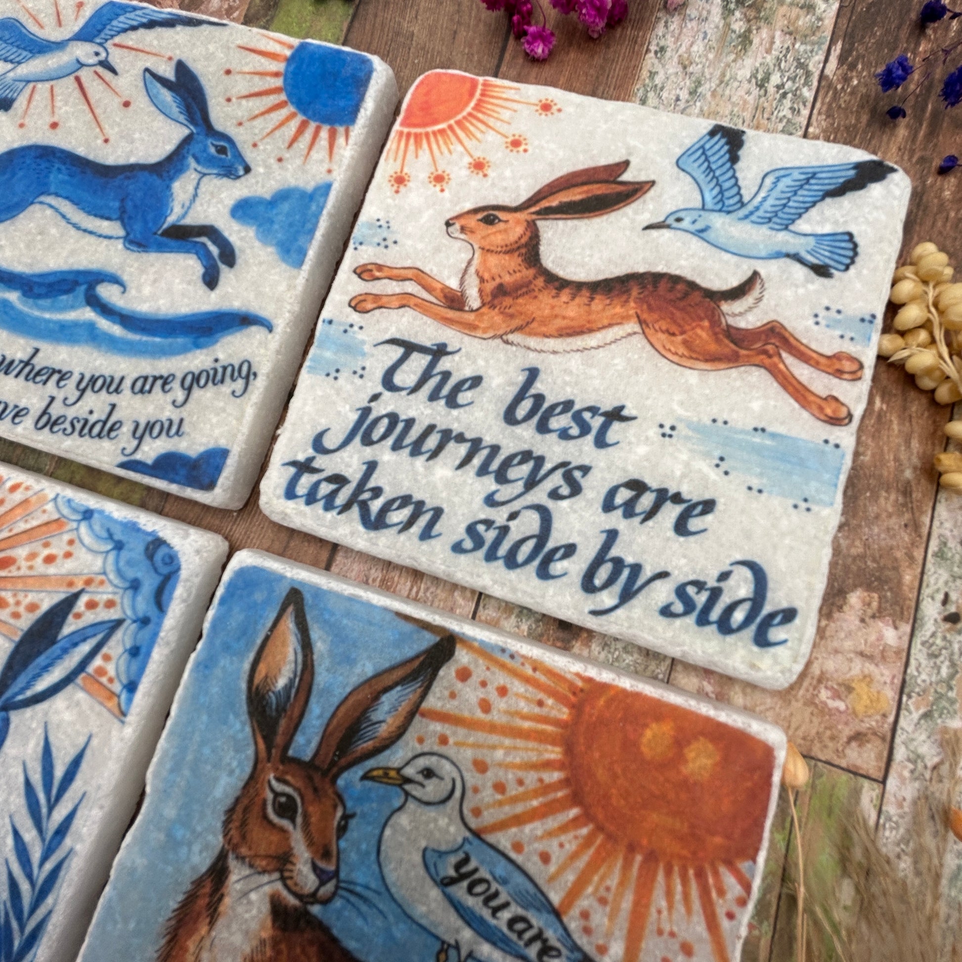 A set of four handcrafted stone coasters inspired by love and friendship, featuring softly illustrated hares, celestial details, and folk-art motifs in calming blue tones with warm sunlit accents.