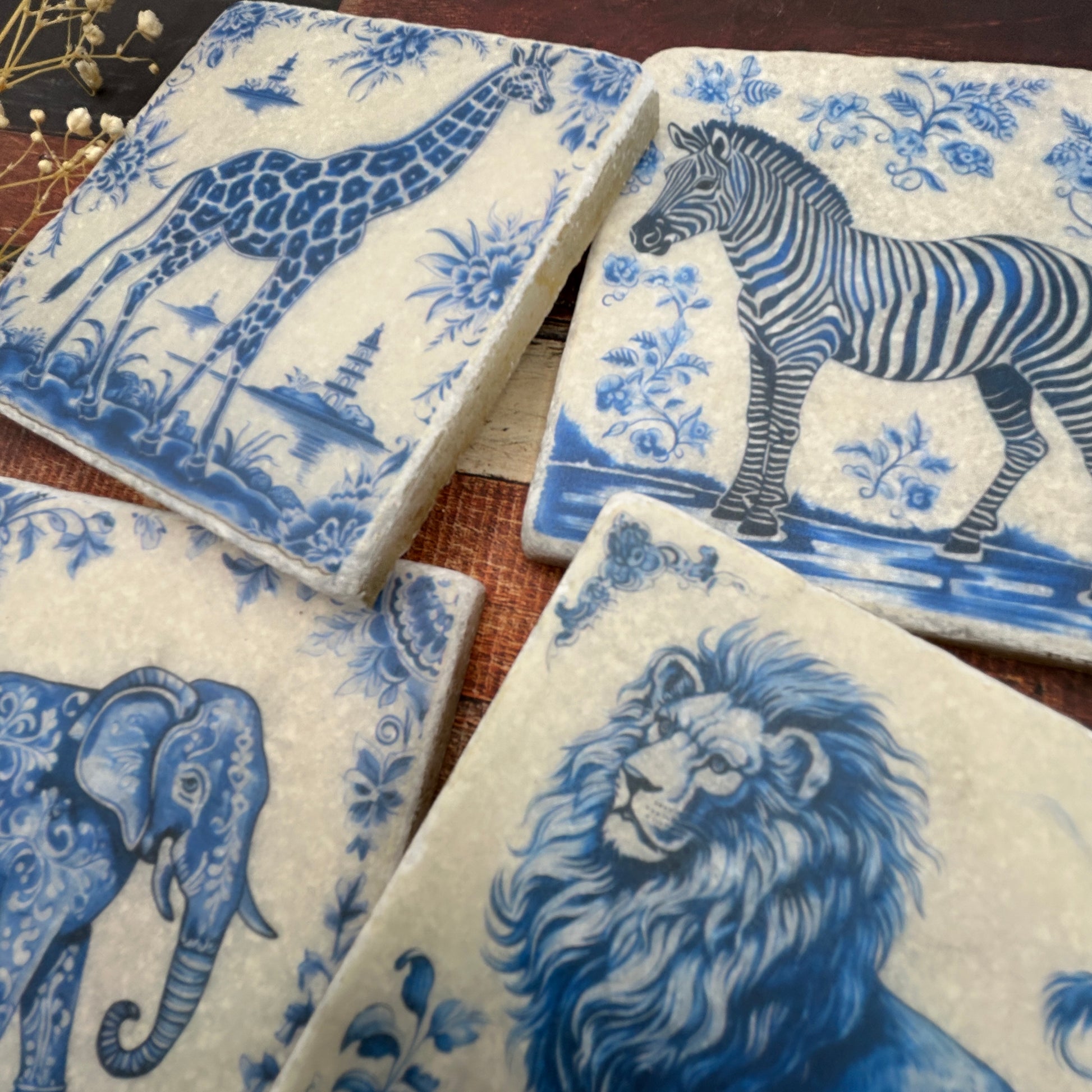 This beautiful set of four natural stone coasters features classic Delft Dutch-style illustrations in blue tones, each with a unique animal design: a lion, zebra, elephant, and giraffe. Measuring 10 x 10 cm, each coaster has a rustic, tumbled finish and a cork backing to protect surfaces. A charming addition to any home!