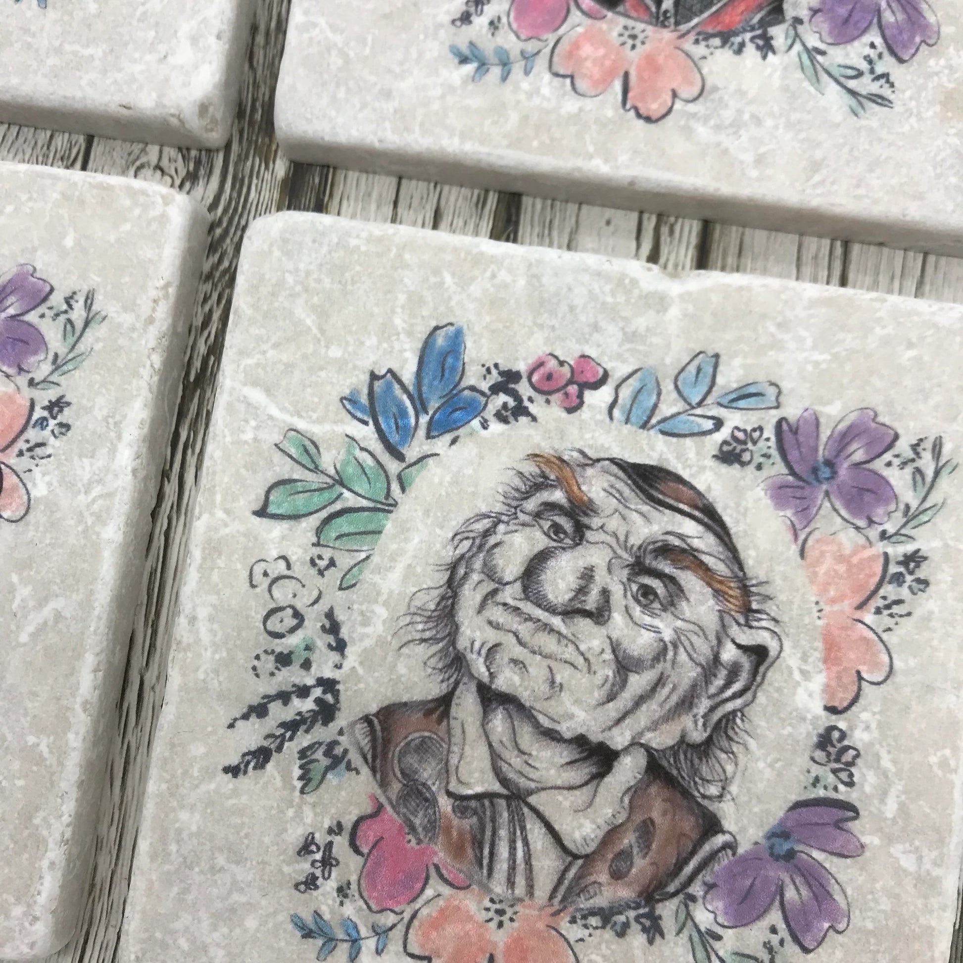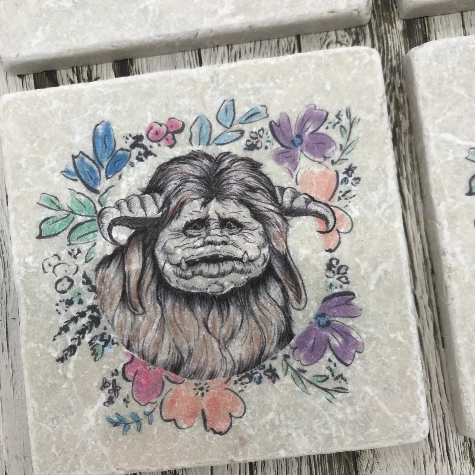 Introducing our enchanting set of stone coasters featuring beloved characters from the cult classic movie, “The Labyrinth.” Each coaster in this set of four showcases original illustrations of iconic characters: Ludo, Hoggle, Sir Didimus, and the Worm, bringing the magic of the labyrinth right into your home.