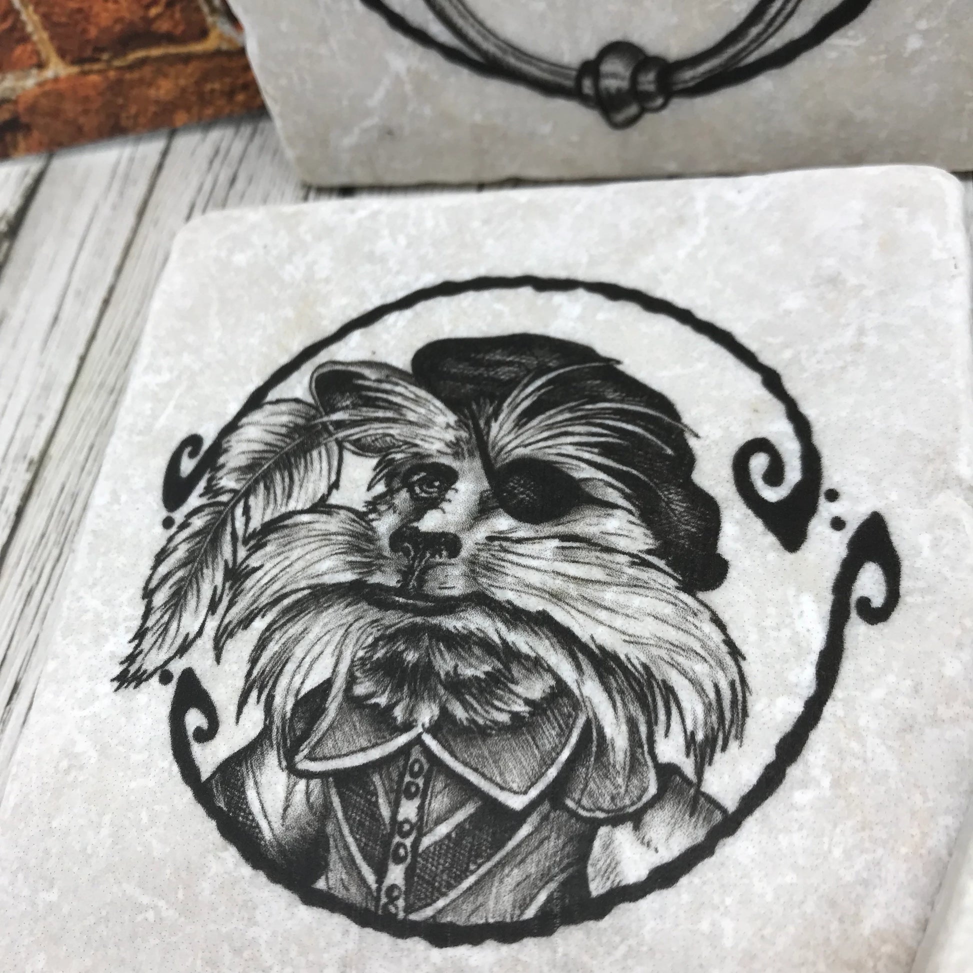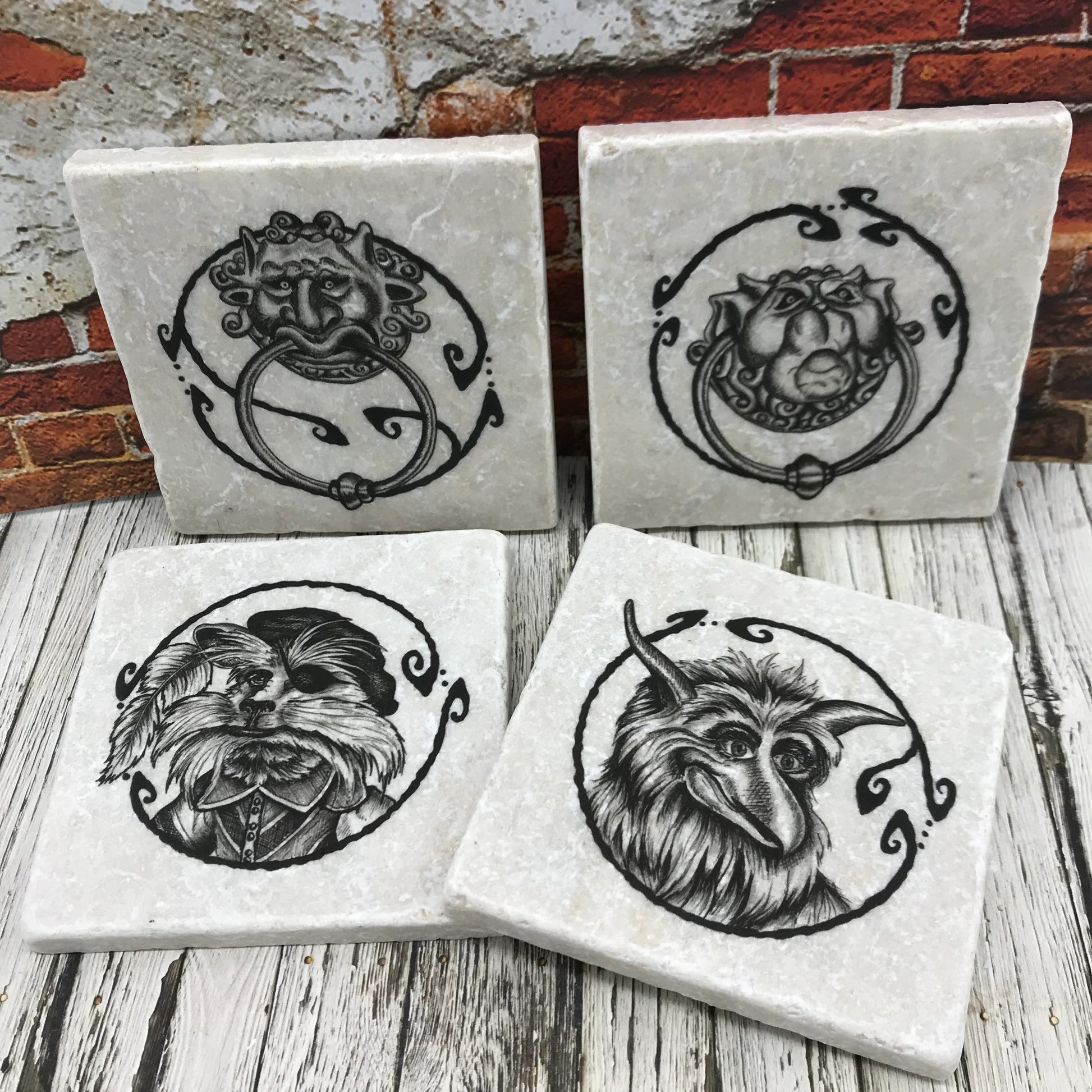 Introducing our exceptional set of stone coasters adorned with original black and white hand-drawn illustrations of iconic “Labyrinth” characters. This set of four coasters celebrates the mystical world of the movie, featuring the Left Door Knocker, the Right Door Knocker, a Fiery, and Sir Didimus.