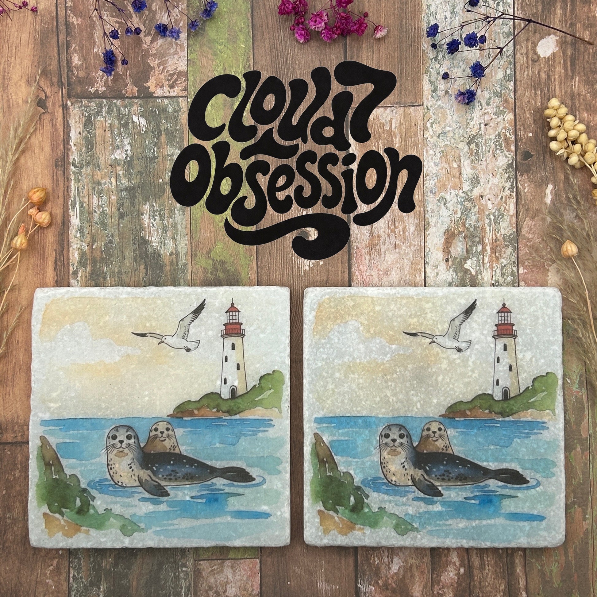 A peaceful set of two handmade stone coasters featuring a pair of seals drifting in calm coastal waters beneath a lighthouse and soaring seabirds. Illustrated in a soft, vintage storybook style, these coasters capture the gentle charm of the British seaside. Finished with cork backs to protect surfaces, they make a lovely gift for sea lovers and wildlife fans alike.