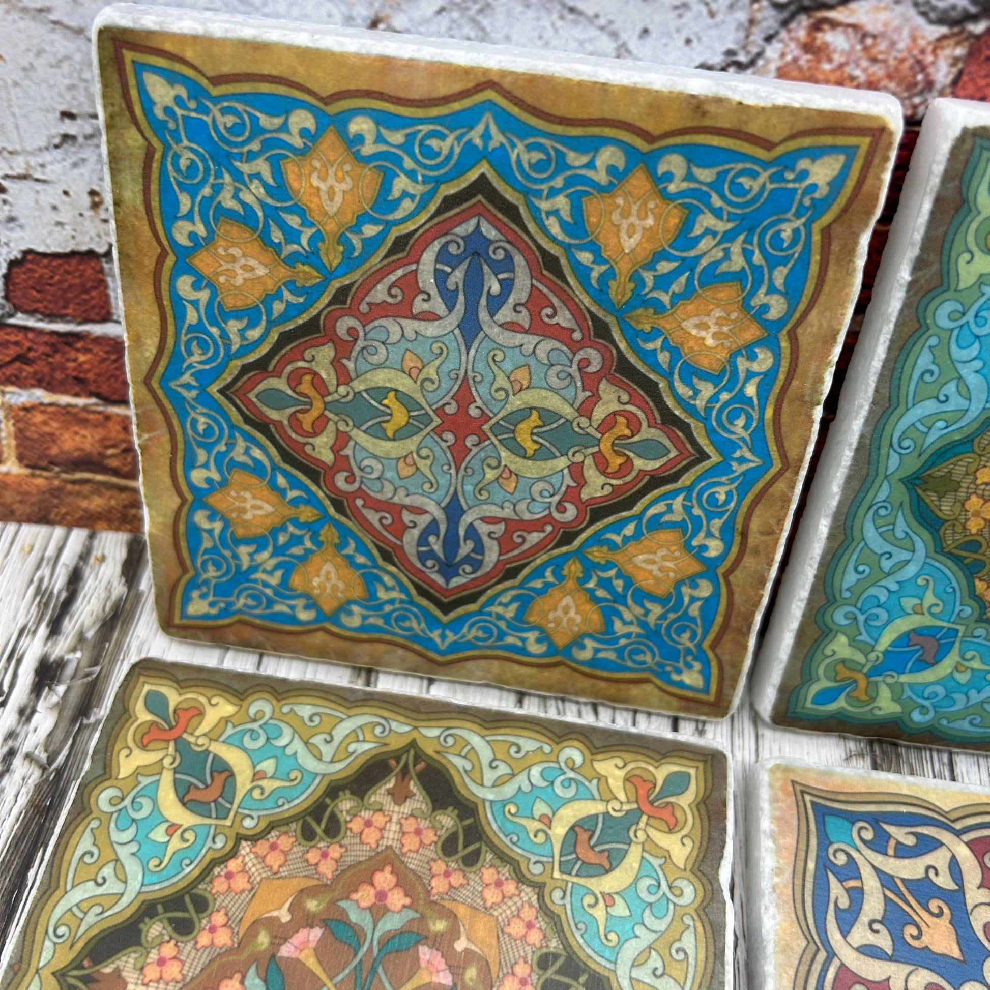 This vibrant set of four coasters features Moroccan-inspired tile designs on 10 x 10 cm natural stone tiles. Each coaster has a unique pattern with a tumbled finish and cork backing, adding a touch of exotic flair to any decor while protecting your surfaces. Perfect for everyday elegance!