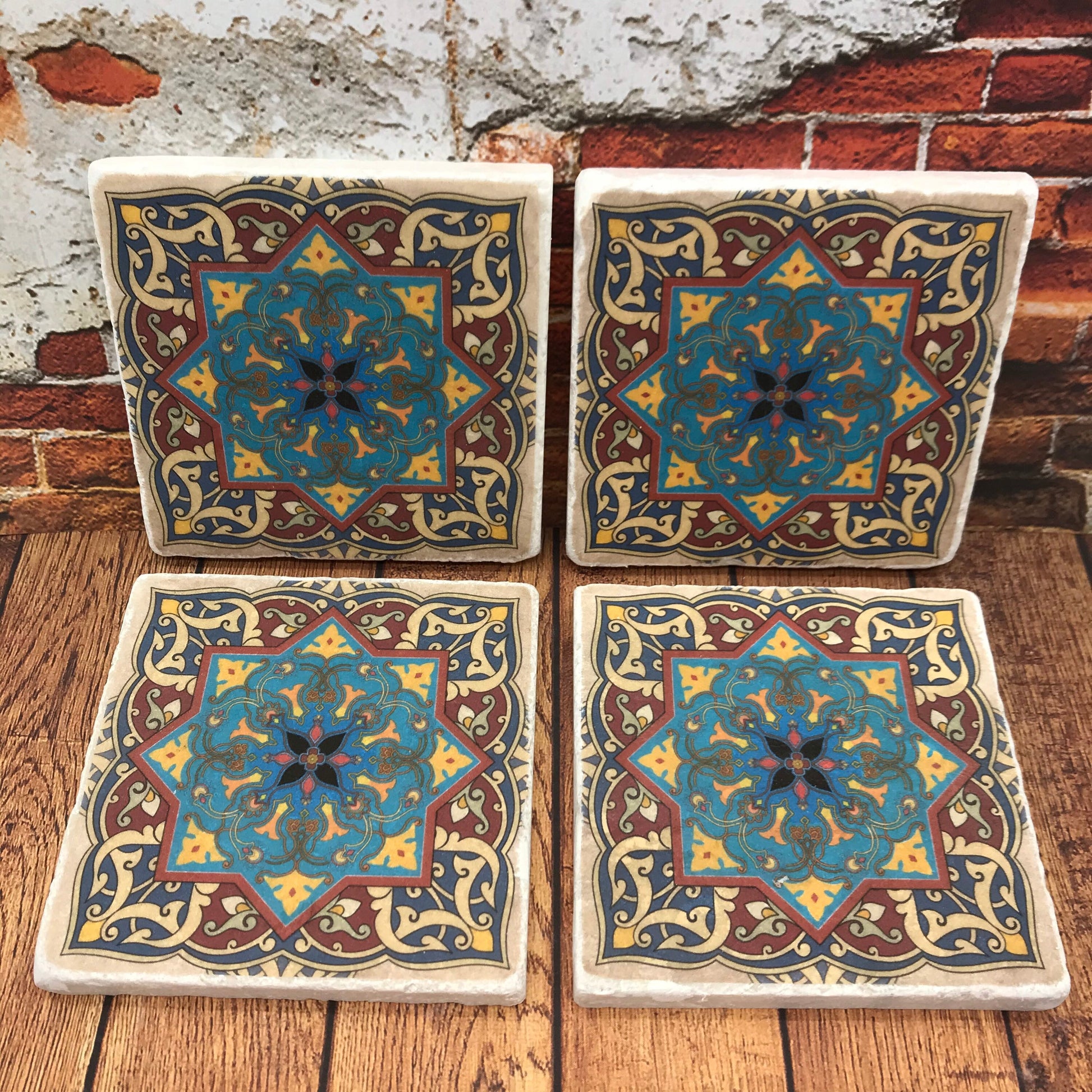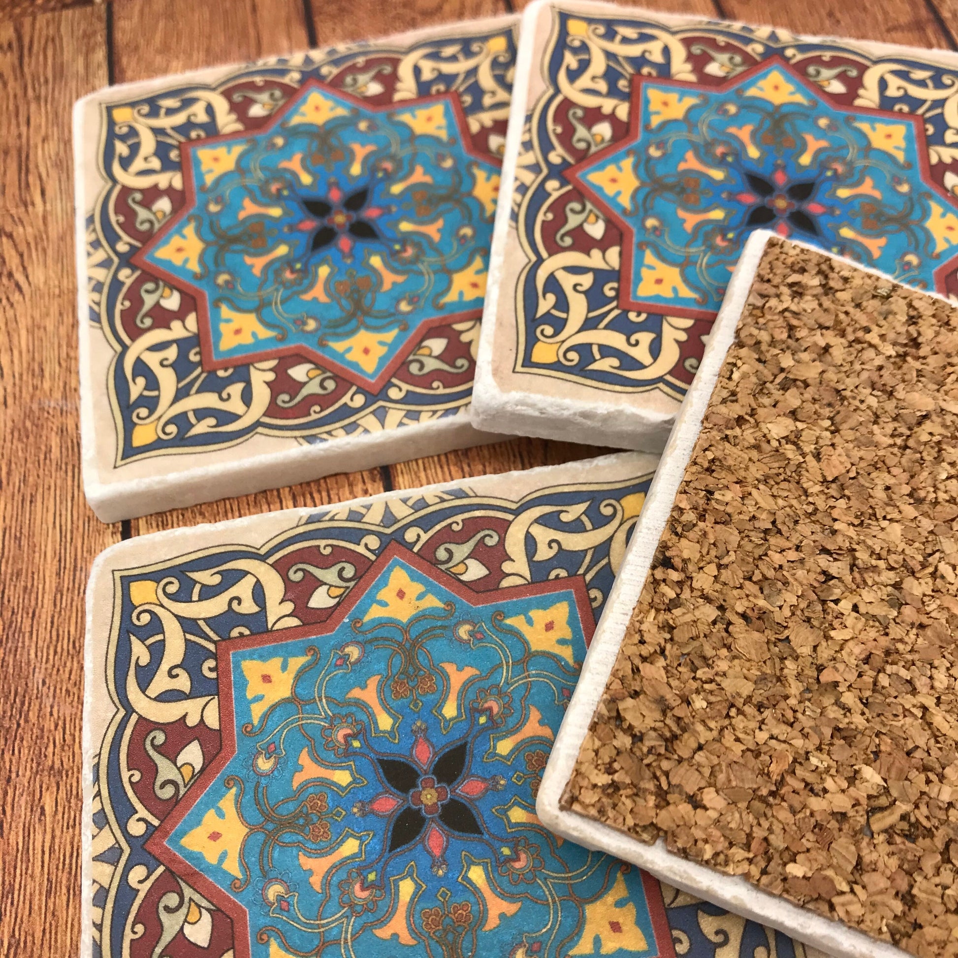 This vibrant set of four coasters features Moroccan-inspired tile designs on 10 x 10 cm natural stone tiles. Each coaster has a unique pattern with a tumbled finish and cork backing, adding a touch of exotic flair to any decor while protecting your surfaces. Perfect for everyday elegance!
