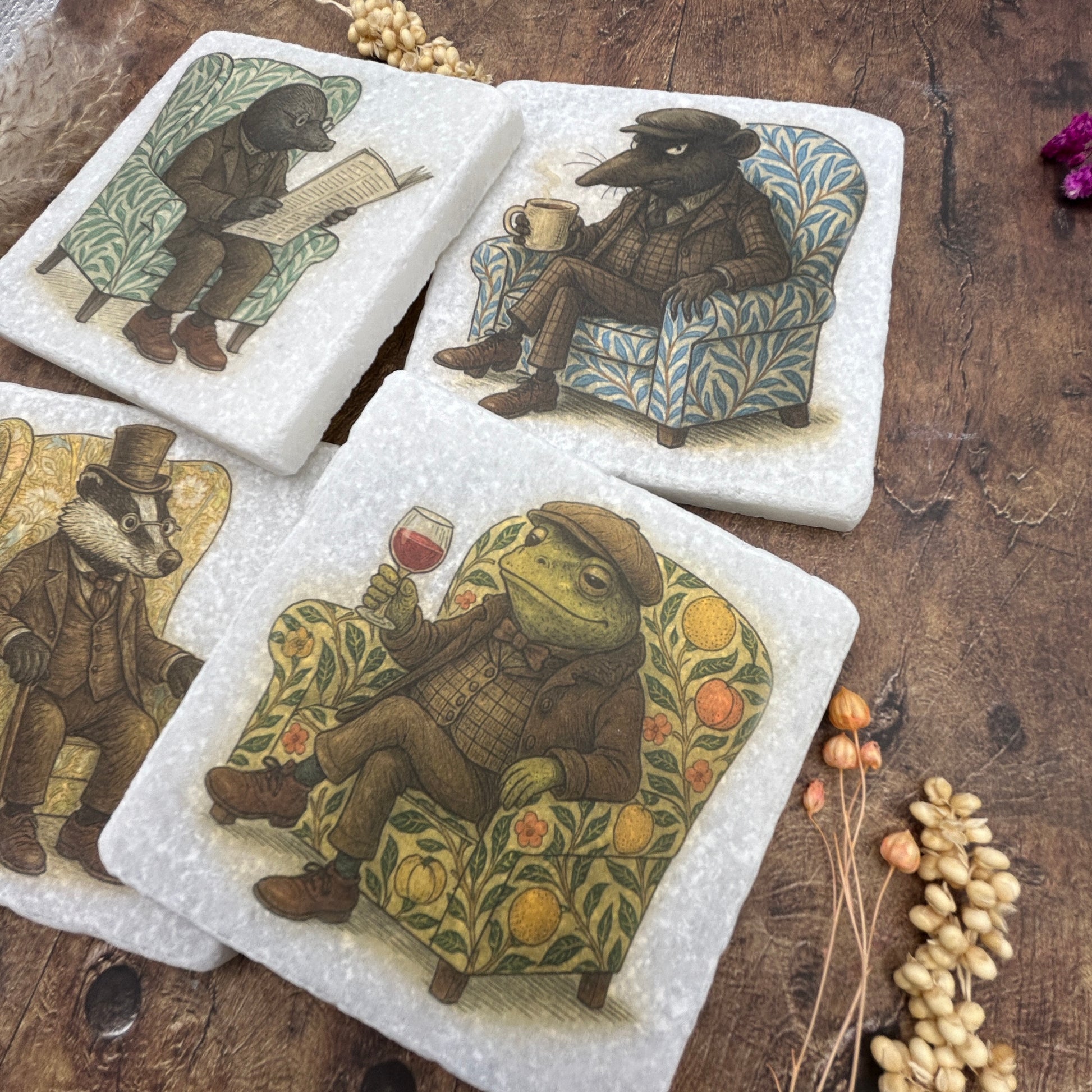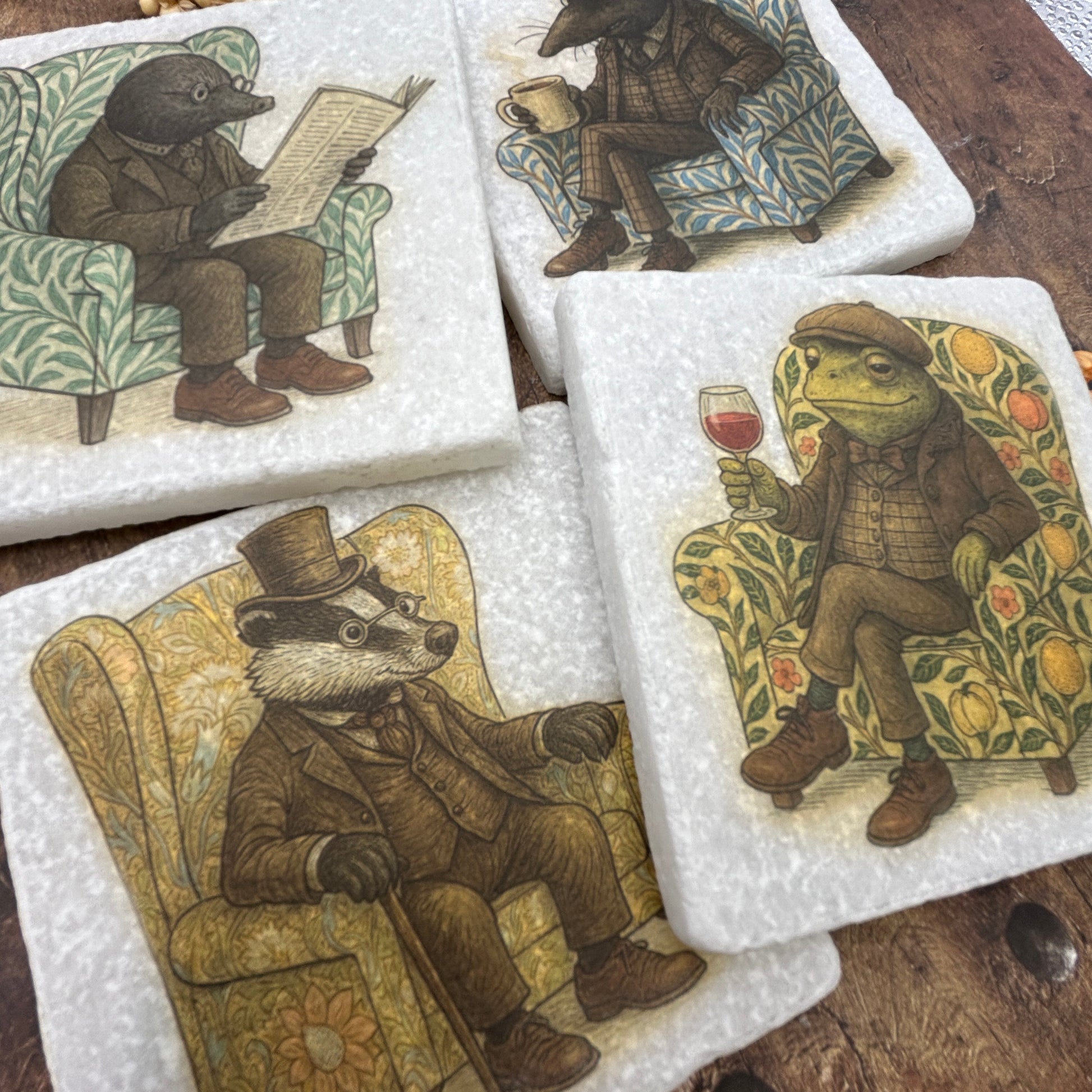 This charming set of four stone coasters brings together the timeless elegance of William Morris–inspired patterns with the beloved countryside characters of Mole, Ratty, Toad, and Badger. Each coaster features a beautifully illustrated animal dressed in vintage attire and seated in a Morris-style patterned armchair, adding a touch of literary nostalgia and heritage design to your home.