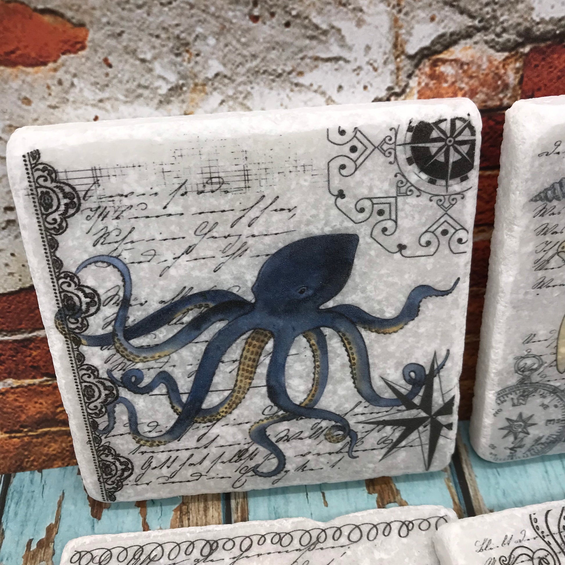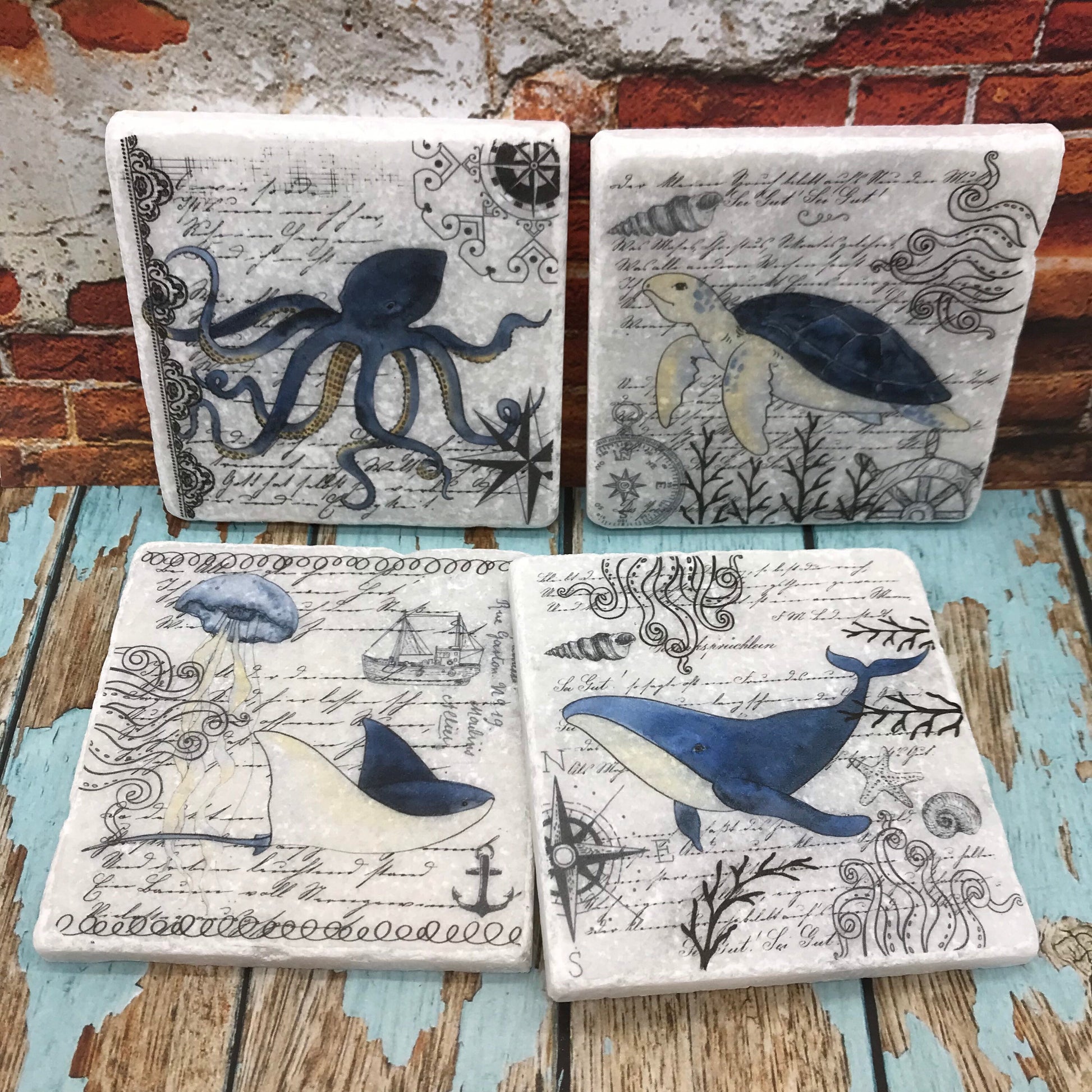 This stunning set of four natural stone coasters showcases nautical-themed illustrations: a sea turtle, stingray, octopus, and whale. Each 10 x 10 cm coaster features a tumbled finish with cork backing, perfect for protecting surfaces while adding a coastal touch to your decor. Ideal for ocean lovers!