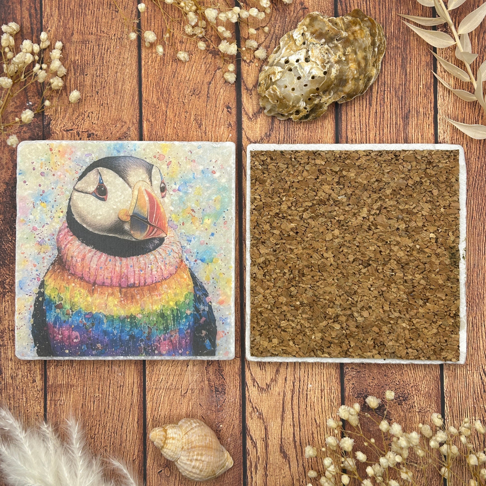 This adorable set of two natural stone coasters features watercolour illustrations of a seal and a puffin, each wearing a rainbow jumper. Measuring 10 x 10 cm, these coasters have a tumbled finish and cork backing, adding charm and color while protecting your surfaces. Perfect for animal lovers!