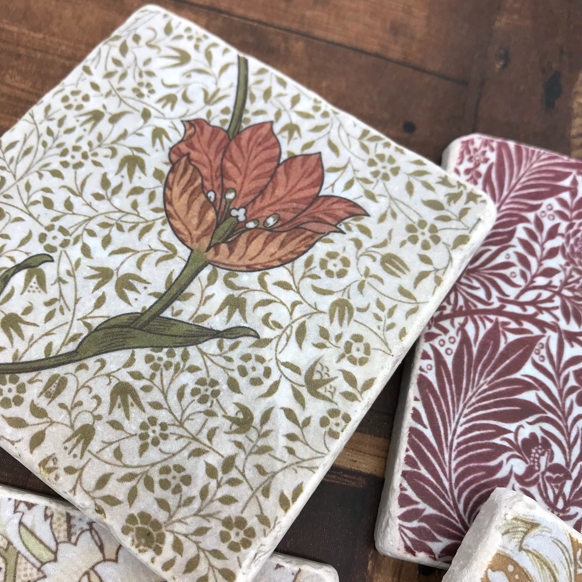 William Morris Natural Stone Coasters, designs by the famous British artist and designer William Morris. These coasters are functional and decorative, providing a surface to protect furniture from scratches and spills, while also showcasing Morris’ intricate patterns and beautiful artwork. They are durable and long-lasting, making them a great addition to any home.