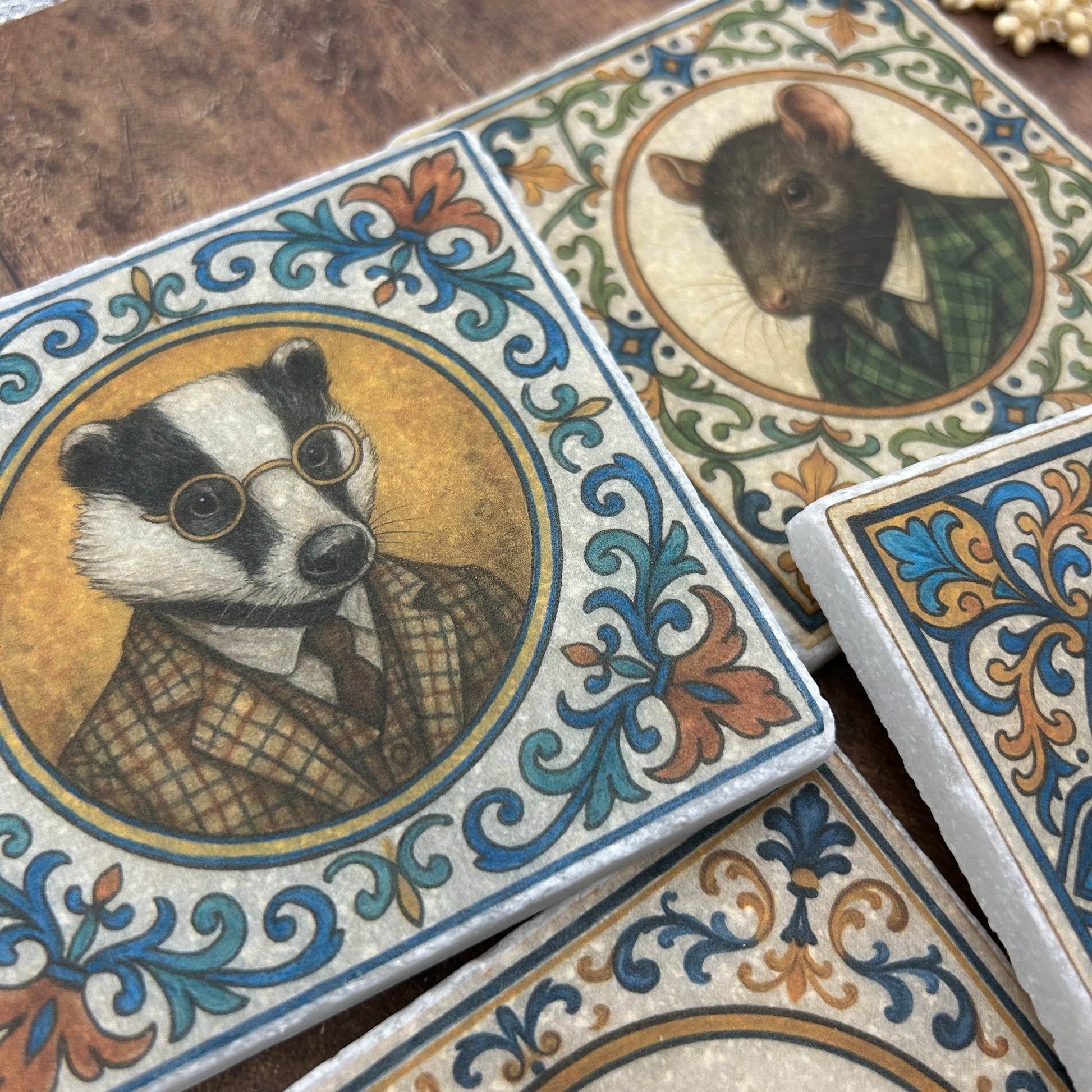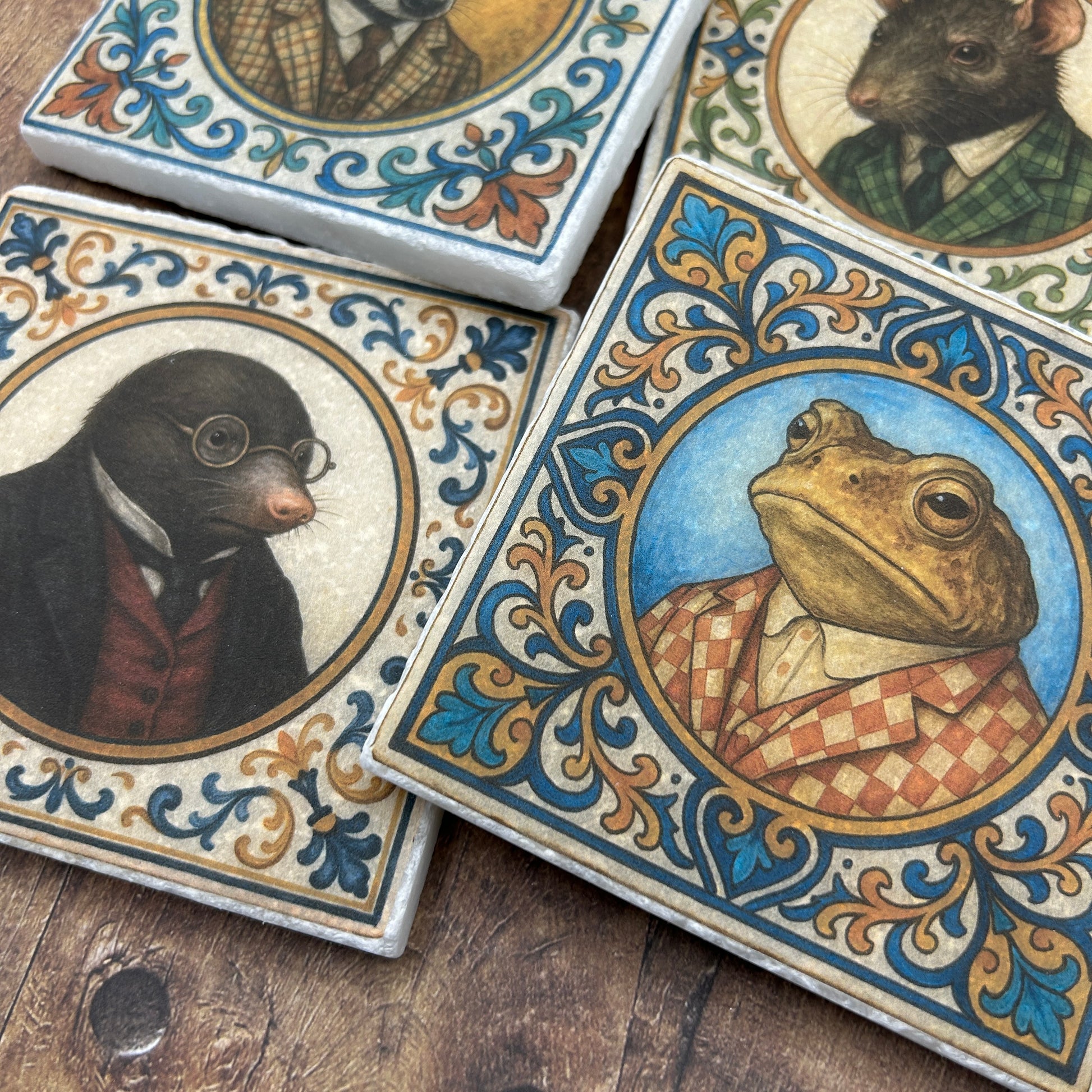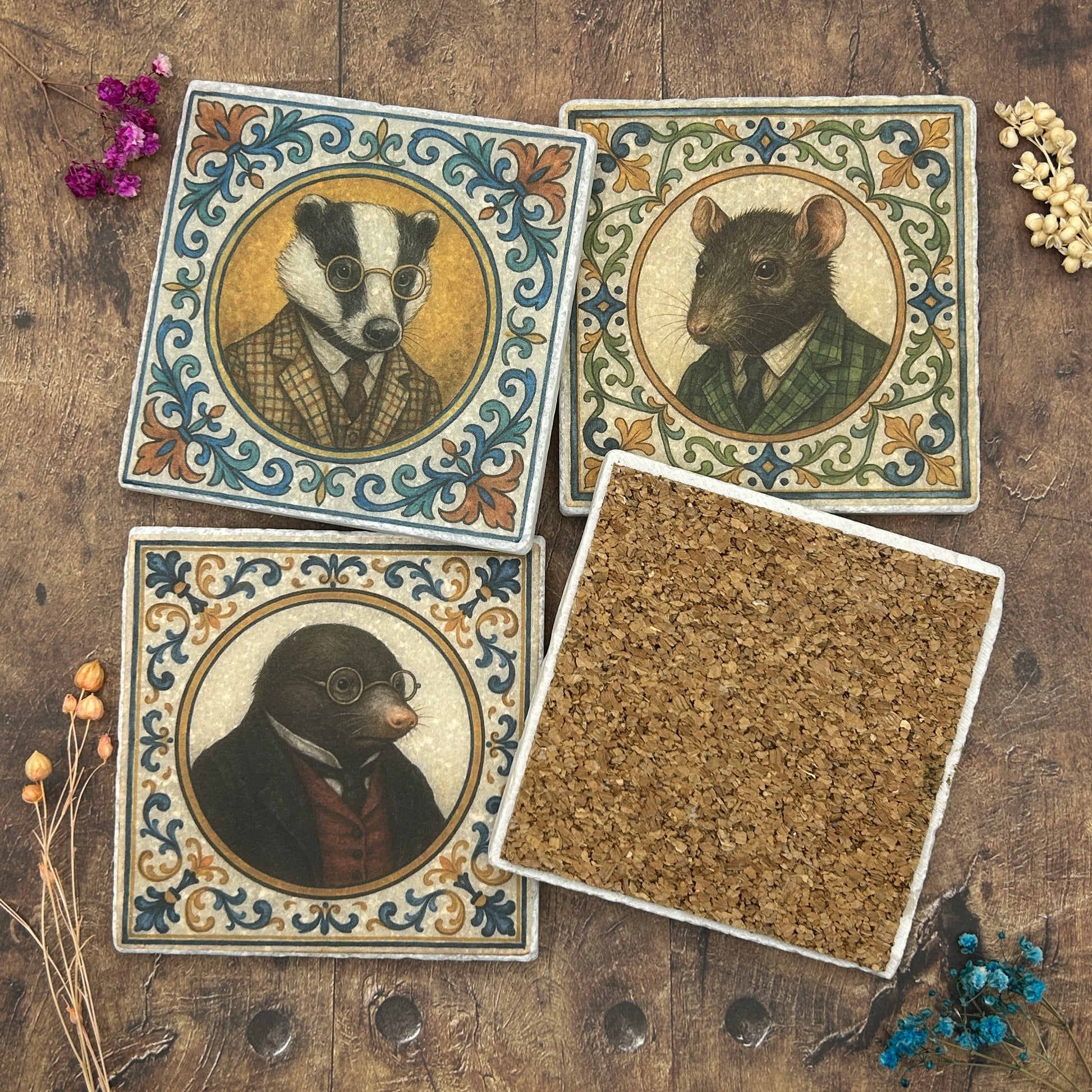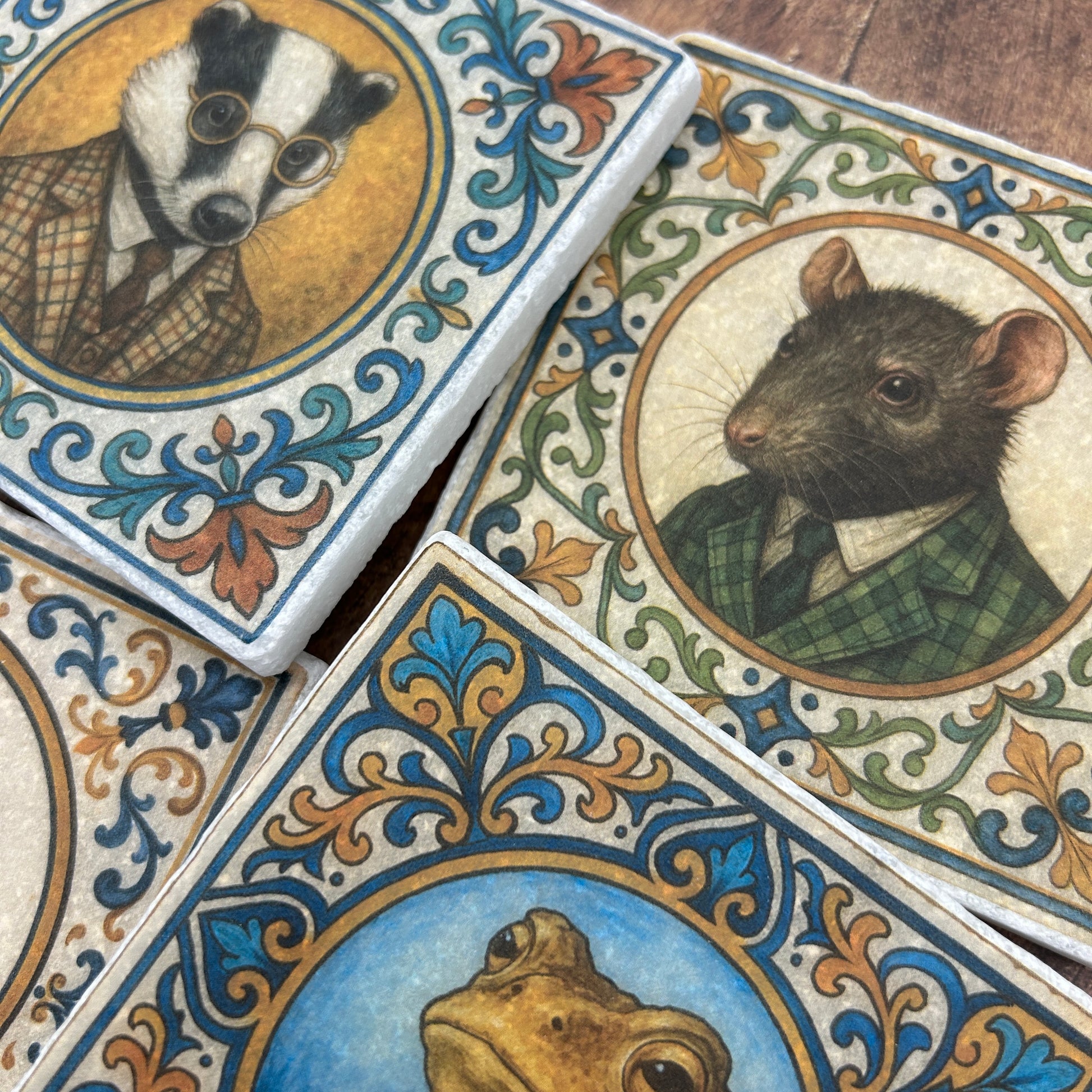 A charming quartet of coasters featuring whimsical portraits of Mole, Badger, Toad, and Rat, each dressed in vintage attire and framed by ornate decorative borders. An artistic blend of classic storybook character and timeless design.